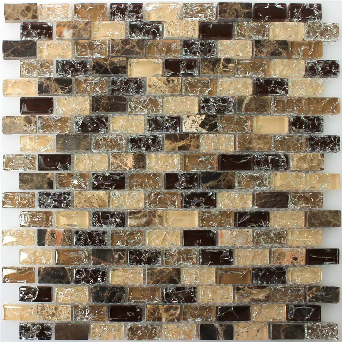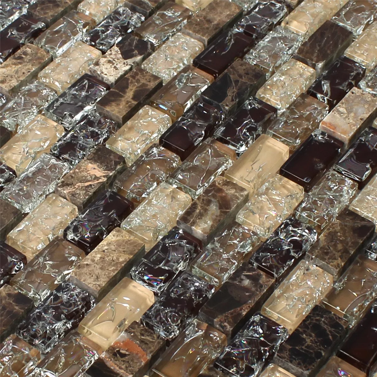 A moderna série de azulejos Malawi Bricks na cor Dark Emperador oferece um efeito particularmente brilhante como efeito mosaico graças à combinação de vidro quebrado com pedras naturais assim que os raios de luz atingem estes mosaicos. O moderno mosaico de pedra natural é polido em todas as partes e, portanto, muito fácil de manter. O mosaico de vidro é feito de vidro puro, tornando os mosaicos do Malawi uma solução visualmente atraente e ecológica para todas as paredes da casa. Porque o mosaico de pedra natural de alta qualidade não chama apenas a atenção no banheiro ou no corredor. O mosaico de vidro inteligentemente desenhado, disponível em diversas cores, evoca um toque de luxo em todos os cômodos da casa, pois as pedras de vidro brilham como diamantes.