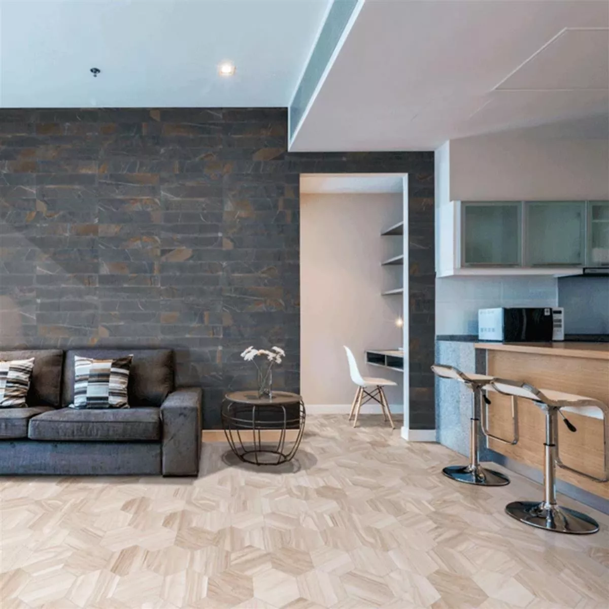 Os ladrilhos Hexwood impressionam pela sua superfície mate e aspecto de madeira autêntica, o que confere a cada divisão um ambiente acolhedor e convidativo. Com uma classificação de abrasão de 2, são ideais para áreas de tráfego médio e são perfeitos para cozinhas, casas de banho, chuveiros e outras áreas húmidas, bem como espaços interiores.
