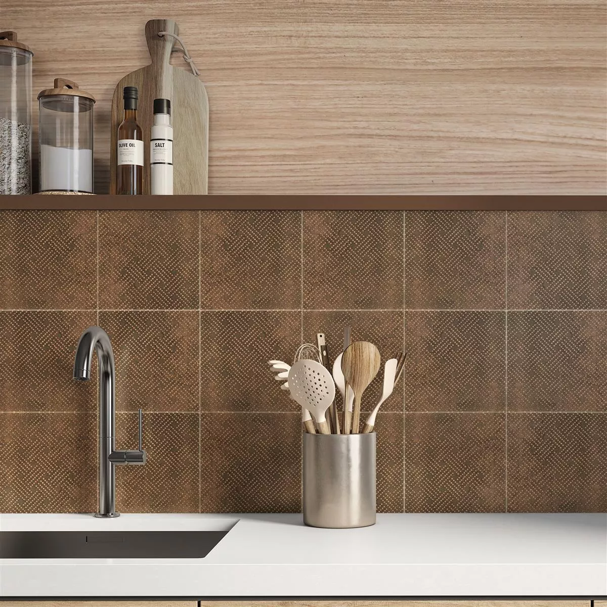 A elegante cor cobre, aliada ao grés porcelânico de elevada qualidade, conferem aos azulejos um aspecto vintage intemporal. Graças à superfície mate, são perfeitos para zonas com piso radiante e ao mesmo tempo oferecem resistência ao deslizamento, tornando-os particularmente adequados para casas de banho, zonas húmidas, cozinhas, salas e duches.