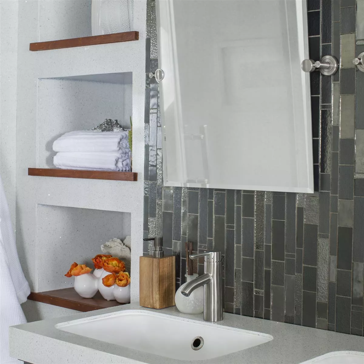 O mosaico de vidro da coleção Metropolis oferece uma excelente solução para quem busca um visual único e deslumbrante. Este mosaico é 100% cortado à mão e feito com 75% de vidro reciclado, tornando-se uma escolha sustentável para lares ecologicamente conscientes.
