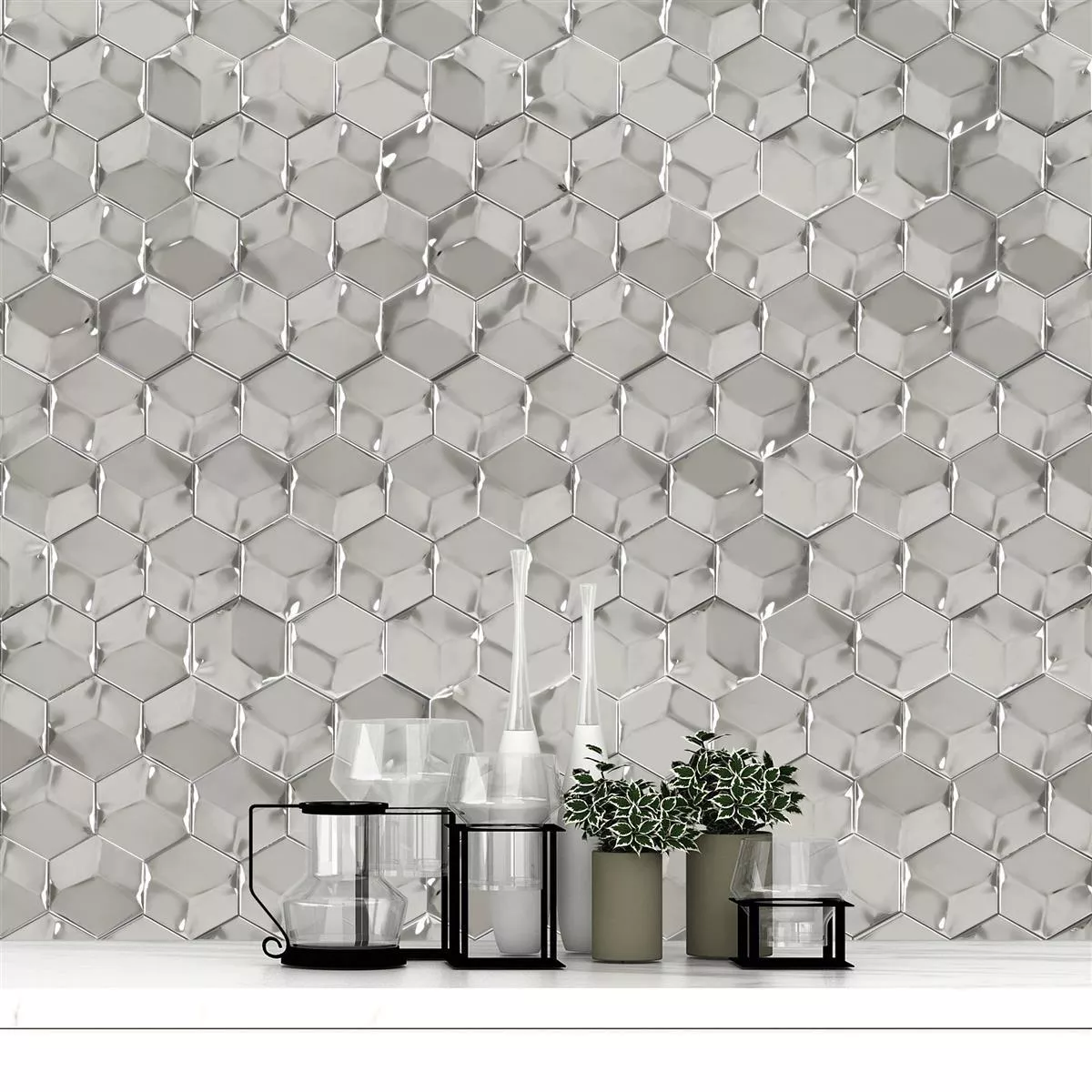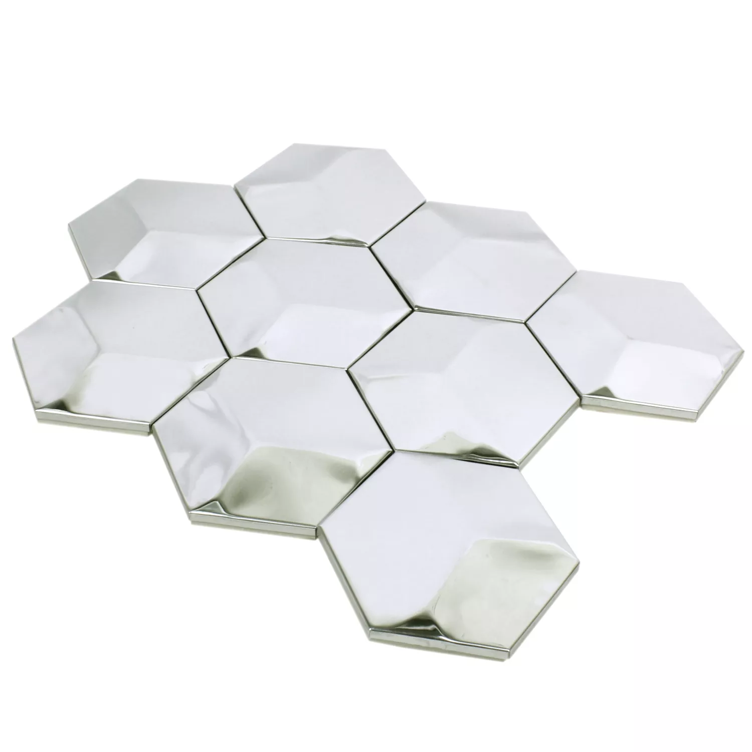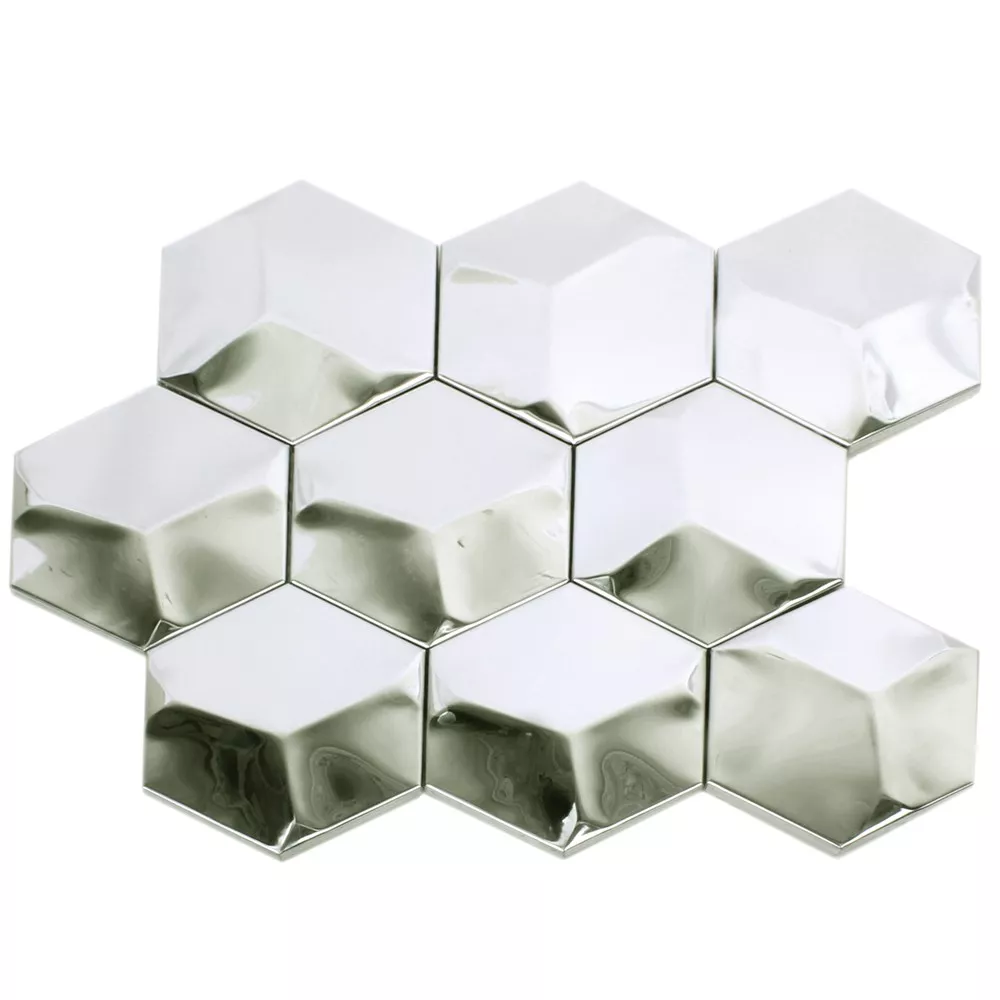 Os modernos mosaicos modelo Contender Hexagon na cor prata brilhante são uma boa escolha para todos os quartos com decoração extravagante. Os revestimentos visualmente atraentes são feitos de aço inoxidável escovado de alta qualidade, para que irão encantá-lo com seu visual único por muitos anos. Os revestimentos robustos são projetados como um mosaico 3D. Portanto, quando a luz atinge, há muitos efeitos bonitos, não apenas por causa da superfície brilhante. A óptica 3D também fornece reflexos de luz especiais que refratam a luz do dia e qualquer luz artificial na sala de uma forma particularmente fascinante.